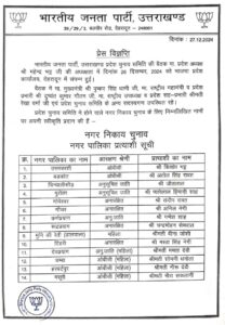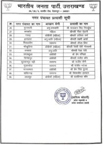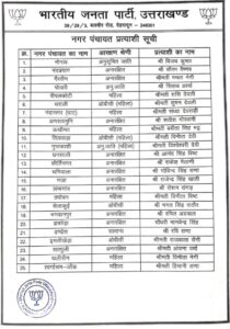 भाजपा ने नगर पालिका व नगर पंचायत अध्यक्ष पद के लिए जारी की पहली सूची। देखें किसको कहां का मिला टिकट।